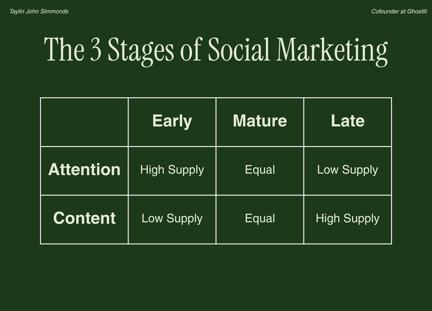 Each stage is defines by the supply and demand of content vs. attention.